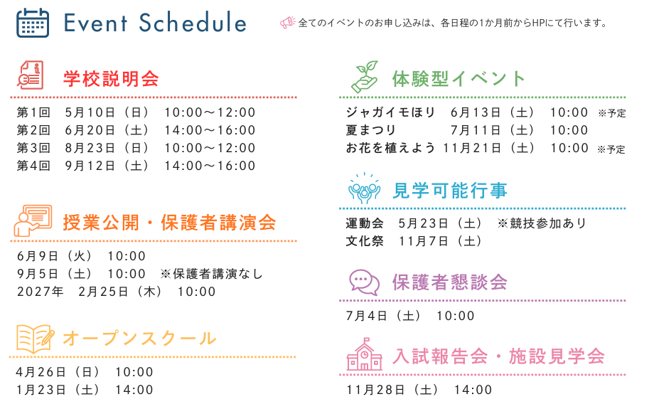 令和8年度のイベント日程は,下記の通りです。 すべてのイベントは,1か月前より学校ホームページにてお申し込みができます。 新たに,7月には「夏まつり」を実施いたします。 皆様のご参加を,職員一同心よりお待ちしております。